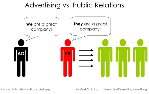 - Οι Δημόσιες Σχέσεις παράγουν έργο υποδομής για τη διαφημιστική επικοινωνία . Για παράδειγμα εάν μας μιλήσει υποτιμητικά ο πωλητής μίας επιχείρησης δημιουργούμε μία κακή εικόνα γιαυτόν και την ίδια την επιχείρηση την οποία εικόνα δεν μπορούν να αλλάξει η διαφήμιση γιατί έχουμε μία κακή άποψη .Συνεπώς πρίν απο κάθε διαφημιστική καμπάνια προηγείται η δημιουργία των ευνοικών απόψεων .